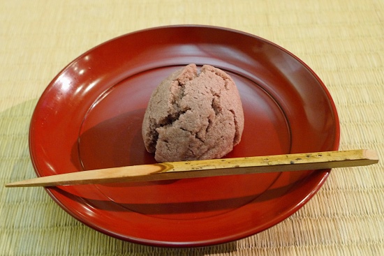 黒い木の皮を残しつつ先端を削って尖らせて、それで和菓子を切っていただきます。