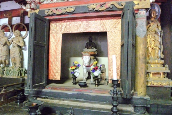 馬に乗る薬師如来。2013年撮影。肝心のお顔か暗いですが当時の撮影の限界ご容赦。平安時代作と推定。県指定文化財
