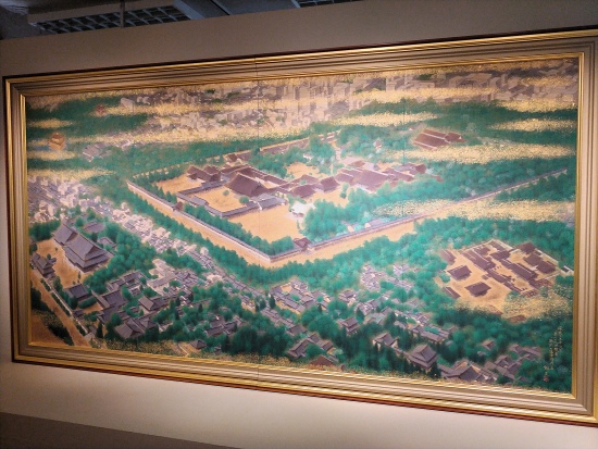 第二会場では、日本の風景。八重の雲がたなびく出雲の大画面から、その奥は都の洛中洛外図二作品。京都の二条城や御所を中心に今と昔の都のようすが散りばめられます。