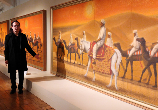 壮大な8連作の《大シルクロード・シリーズ》は、朝焼けの砂漠を進むラクダの商人隊列と、月明かりを反対方向に進む隊列が並んでいます。